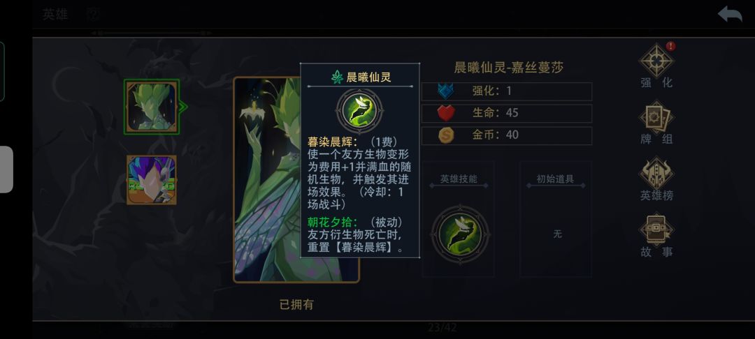 【暮染晨辉】:(1费)使一个友方生物变形为费用+1并满血的随机生物,并触发其进场效果。(冷却: 1场战斗)