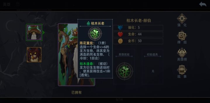 本帖攻略限定不使用复活功能和卷轴,不过于依赖符石的5级英雄通关梦魇模式,本期的主角为:枯木长老,首先来看看他的技能: