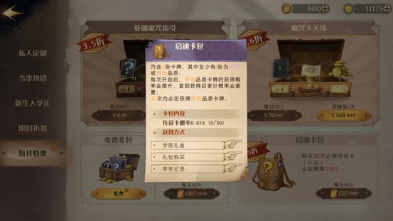 每日特惠中价值6元的基础魔咒指引礼包包含1张稀有卡牌、1张图书馆通行证、100金币,相对于以上两种礼包,基础指引礼包有稍许的不划算,但1张稀有卡牌极大概率会抽中各种搭配中的万金油哦。