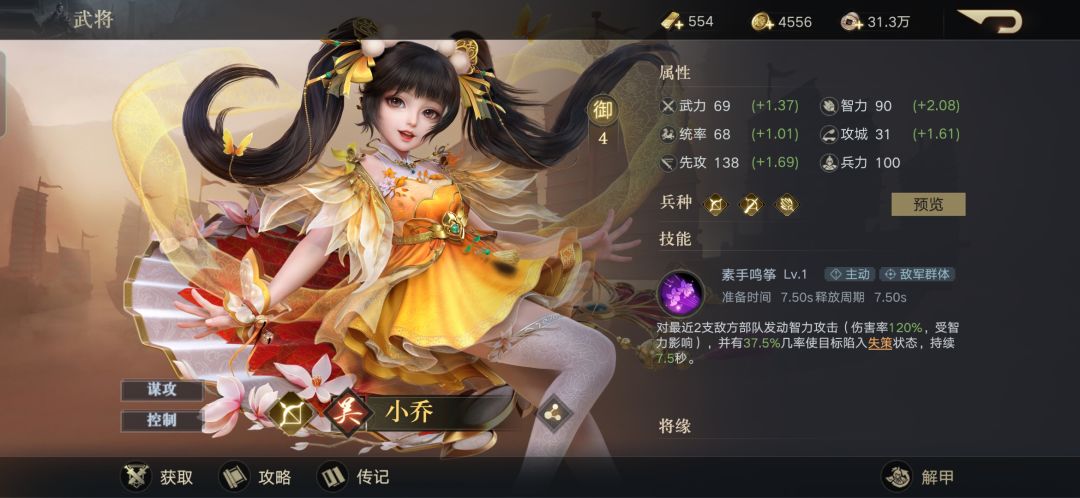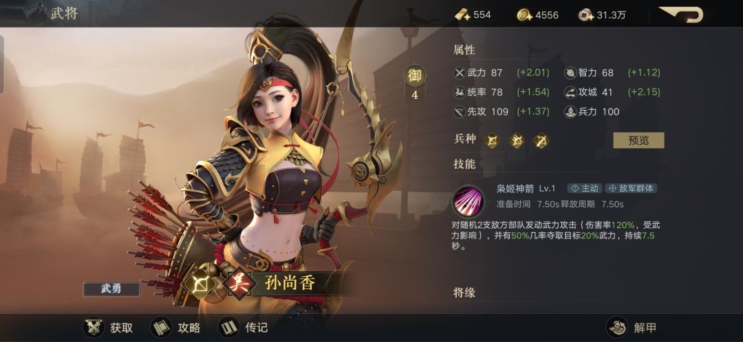 技能伤害中规中矩,成长还行,武力夺取比较厉害,按照200武力(后期由于科技、兵种、阵营加成等等,普通武将很容易上200)计算,平均能夺取200*2*0.75*0.2=60点武力,还减对方的武力,是相当高的加成了。由于御低也比较好搭配阵容拆的宝物很适合女性输出武将,比如王异、孙尚香、吕姬技能