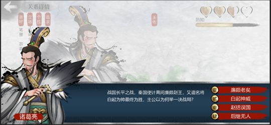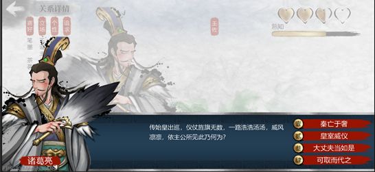 黄金易求,知己难得。熟知阶段后玩家可与武将议古论今,通过了解不同的武将立场、追求、个性,揣测武将心仪答案作答以提高好感度,达到信赖。