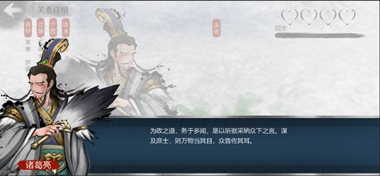 主公可通过闲谈达到熟知、赠礼达到信赖、宏论达到挚友,到达下一阶段时前一阶段行为将不再增加好感值。