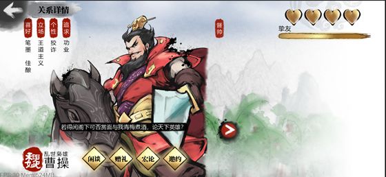 投我以木桃,报之以琼瑶。玩家可获得笔墨纸砚、清茗佳酿、珍馐小食等各类小物以之为礼赠予麾下武将,武将将依据喜好接受或拒绝并依此提升好感度达到挚友。