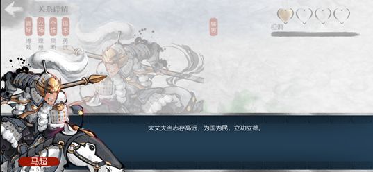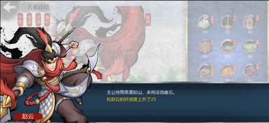 玩家可通过每日闲谈了解武将的言行志趣,累计增加好感度,从相识变为熟知。