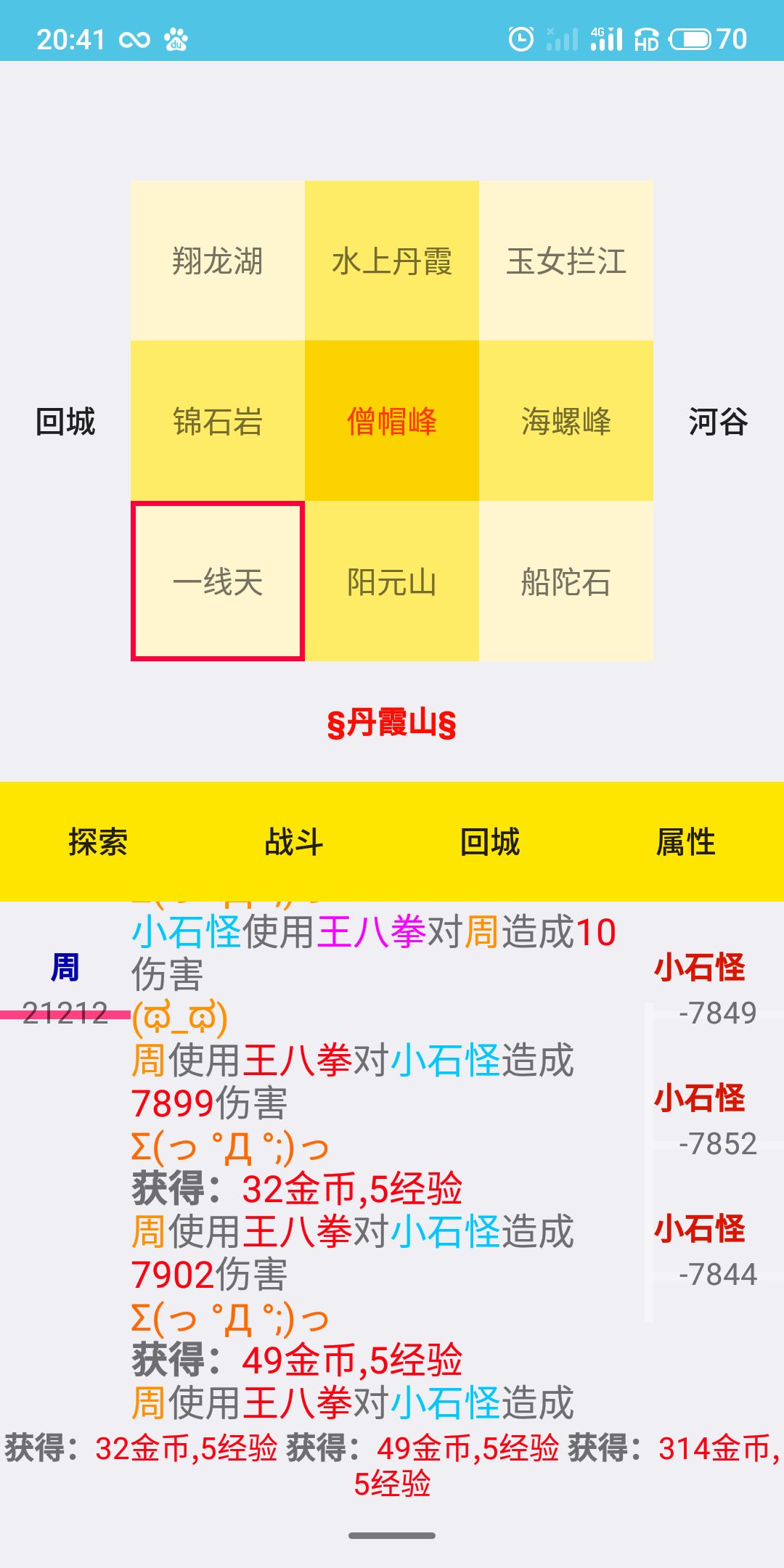 打怪说明:点击探索可以刷怪,出现怪后,再点击战斗就可以打怪了(多次点击战斗可以,连续战斗,一般点10次),每杀一个怪可以获得一个积分,积分可以用于探索宝箱怪战斗兑换材料,普通保底20分,精英40,头目60,首领80