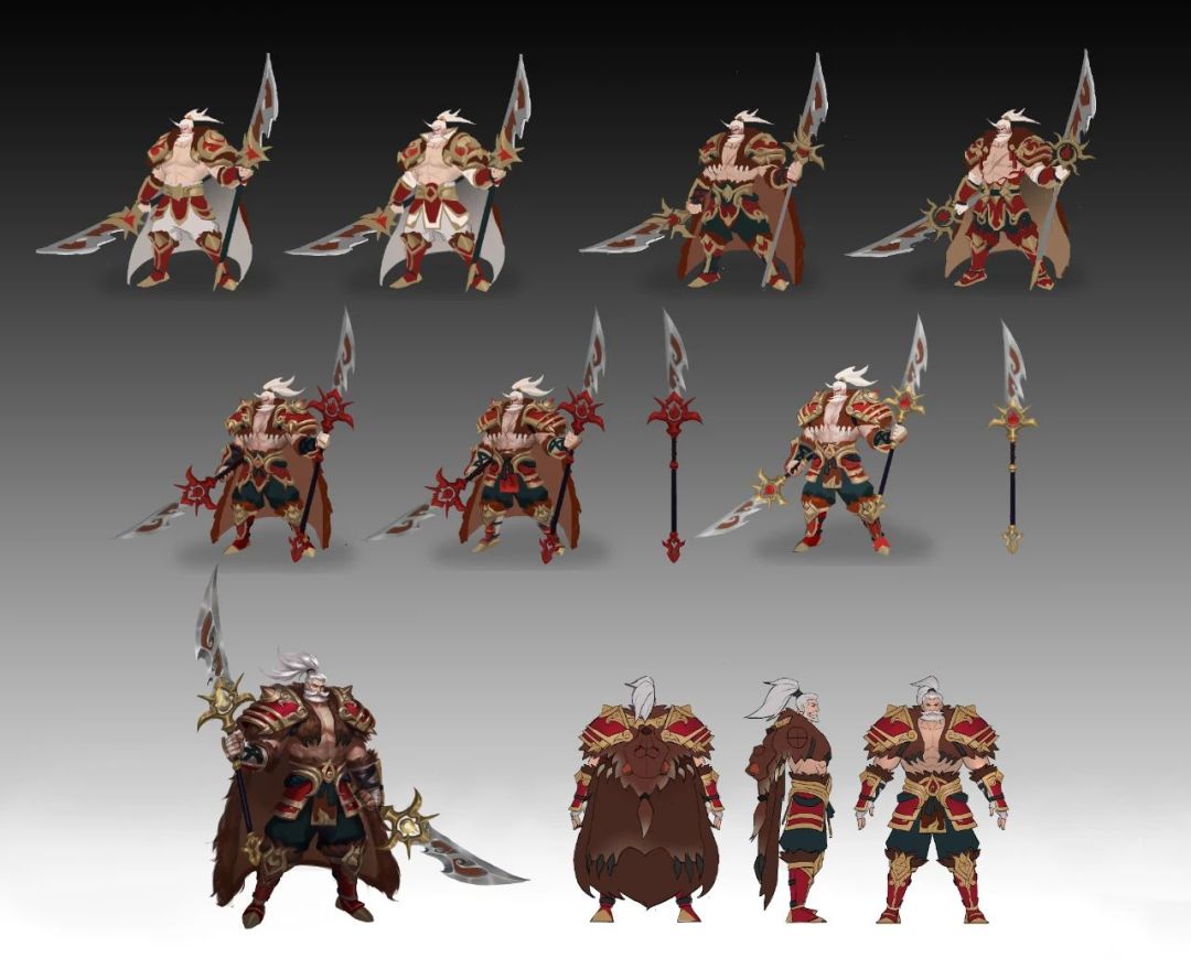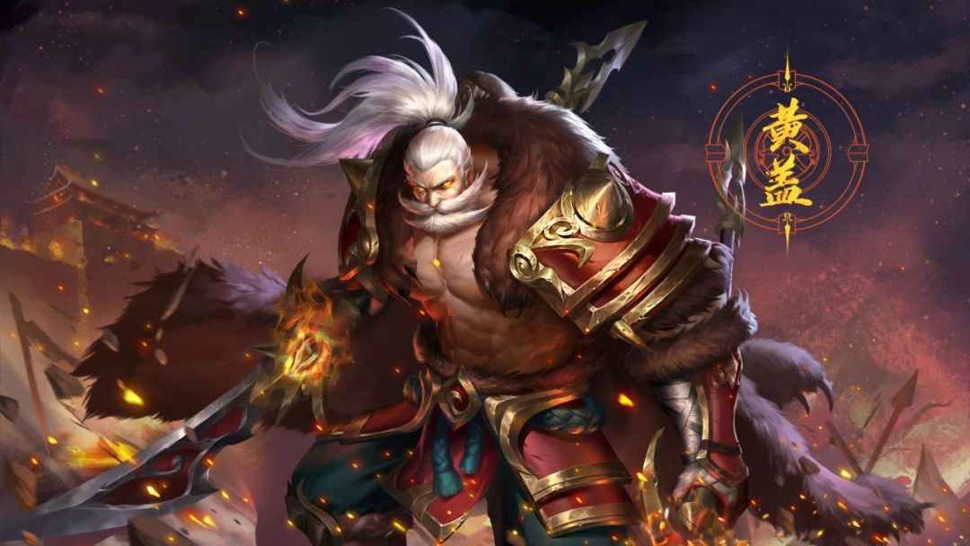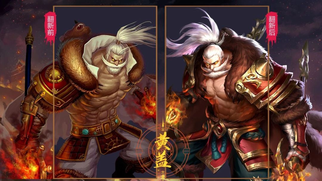 黄盖的整体造型并未作出明显改变,只不过在原有基础上突出了更多的细节,比如肩甲尺寸的增加,腿甲增加了更多的层次,再配上黄盖的两柄“火神双刃”,无不体现出黄盖作为火神族后裔的实力。另外黄盖标志性的胡子和白发,以及凌厉的眼神,更透露出黄盖的老当益壮。