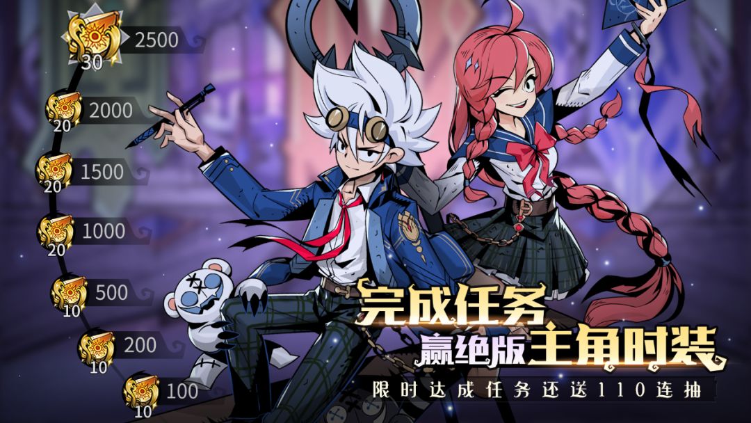 通关主线第1章[暗黑森林]19关时,开放“梦境学院”。完成指定任务,收集“学院星石”,达到指定目标可获得110连抽,和【绝版奖励-学园双子形象(学园正一+学园小樱)】