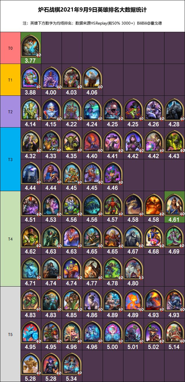 本次使用数据为HSreplay的7日数据,新英雄使用绿底标识,新版本积分清零,所以中位局采用前50%以上玩家,积分为3000+,英雄排名一图流,数字为均场排名