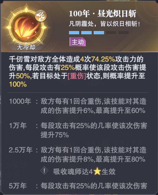 √Tip:千仞雪厚积薄发流的核心技能,集续航、免控、免减益、提升暴伤、永久提升攻击和生命上限为一体,且每种效果的持续回合都能坚持到下一次使用,叠满三层后还能立即使用魂技,配合第一魂技第二魂技,只要队伍能够支持千仞雪到后面几回合,爆发加收割不是问题。