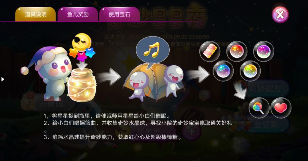 1、本活动分为三部分:捉星星、去催眠、奇妙能力,每天进入活动都会提供免费道具,一定每天进来领取哦~