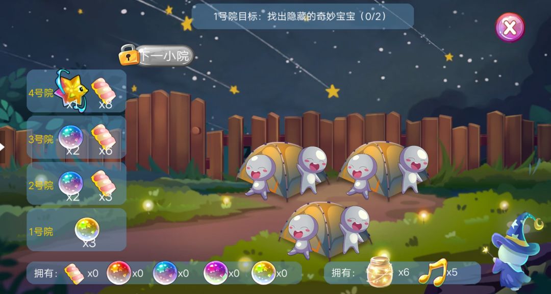 在每个小院中都会有一些小白在露营,请催眠师将他们催眠,找出所需数量的奇妙宝宝还可进入下一个小院,收获更多水晶球及其他奖励~