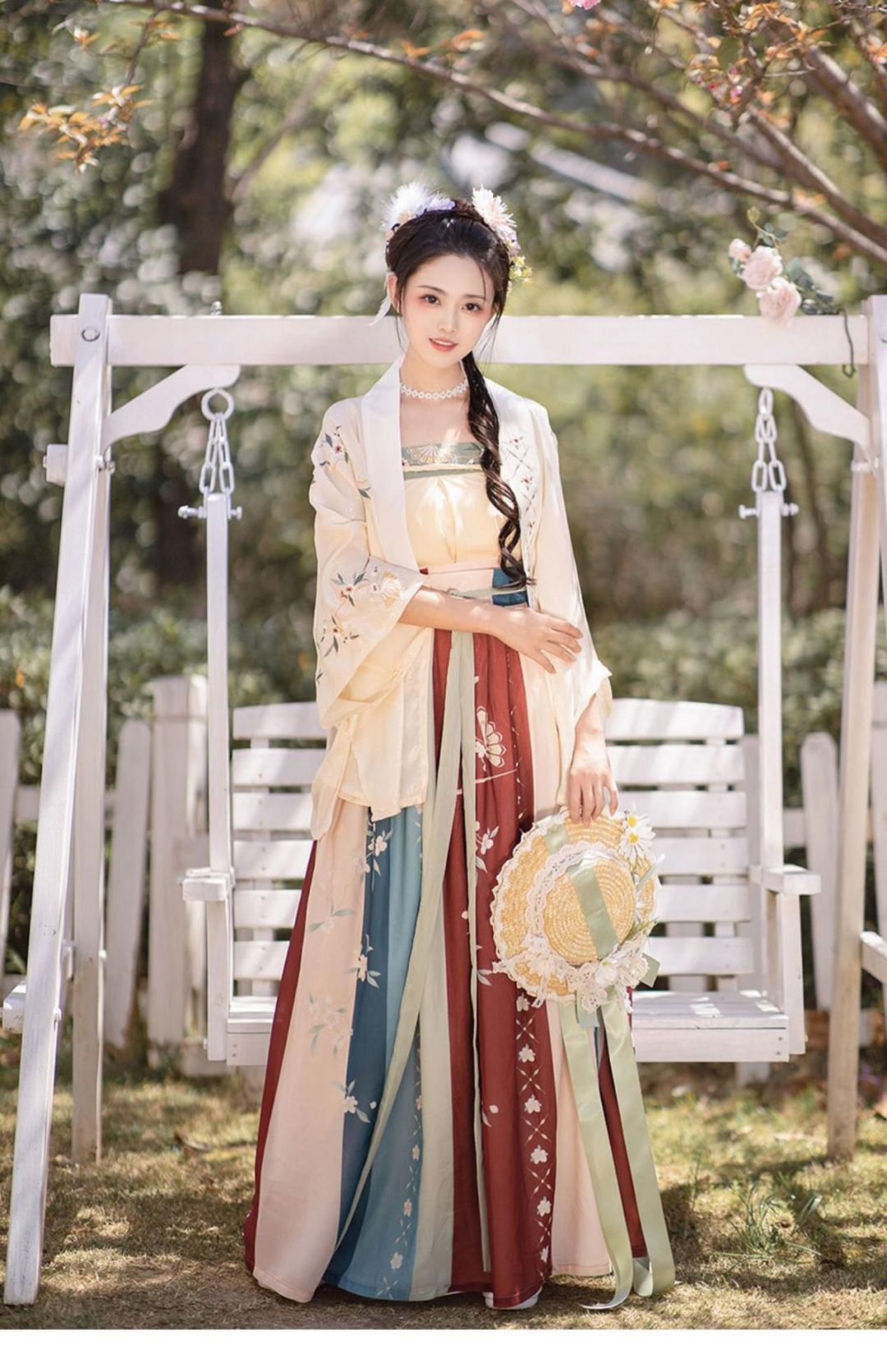 裙裾的杏花是娇羞可爱、爱慕之情和幸运的征兆,它的花色是洁白中透着一些粉嫩,就就像少女脸上的一点红晕,杏与幸同音,花开时象征着好运的来临。清风拂过,淡雅的气息扑面而来。