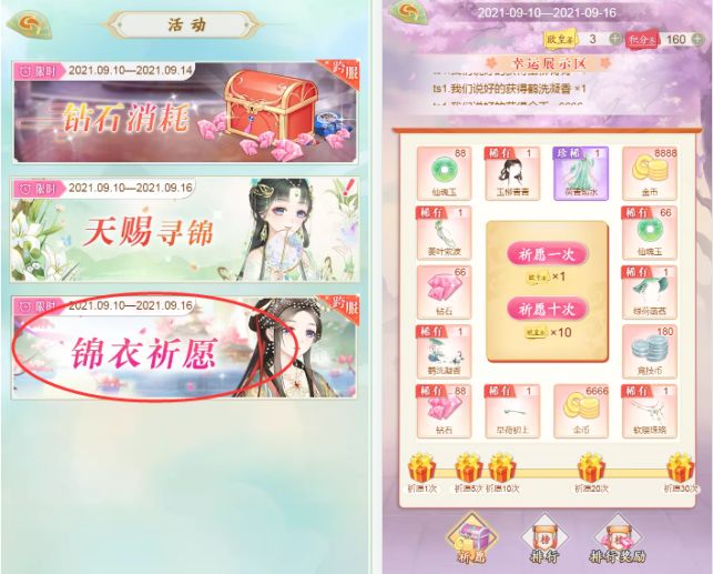 活动时间内,小仙女们在游戏活动中使用欧皇券可在锦衣祈愿活动内进行抽奖,祈愿次数榜单第一的玩家可以获得实物汉服奖励“小确杏”一套。没有得到实物奖励的的小仙女也不用灰心,活动结束后会有相应排名的丰厚道具奖励等着你。