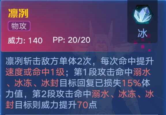 ⑴一技能单体攻击2次,每次命中提升命中或速度1级,第一段攻击溺水、冰冻、冰封目标可以回血,第二段攻击溺水、冰冻、冰封目标可以提升70点威力