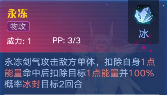 ⑶三技能扣除自身1点能量,攻击命中后扣除目标1点能量并100%概率冰封目标两回合