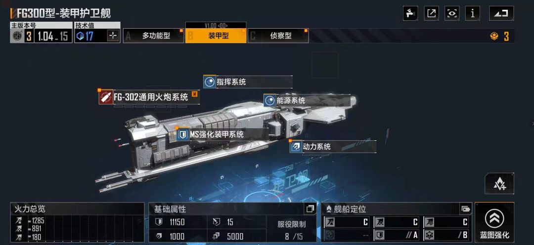 在蓝图研究的过程中,我们会遇到已经开发过的战舰,这其实是这些战舰的子型号,其用途大不相同。以系统赠送的FG300型为例,这个战舰就有三种型号:多功能型、装甲型与侦察型,不同的型号其火力、速度、护甲等数值都不同,所以也有着不同的功能作用。
