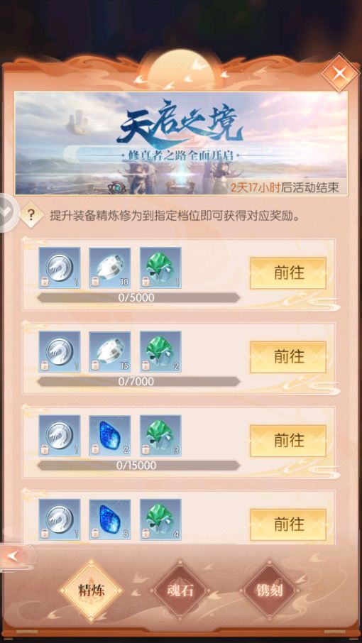 可以看到这个活动的数值条是不高的,但必须得是在活动期间提升的修为,而不是当前修为,所以这个活动对于本身高精炼修为的玩家来说还是比较耗费材料的。因为在+4之后精炼失败是会回退一级,所以乾坤石格外重要(我个人认为是比天罡石更有用一些)。