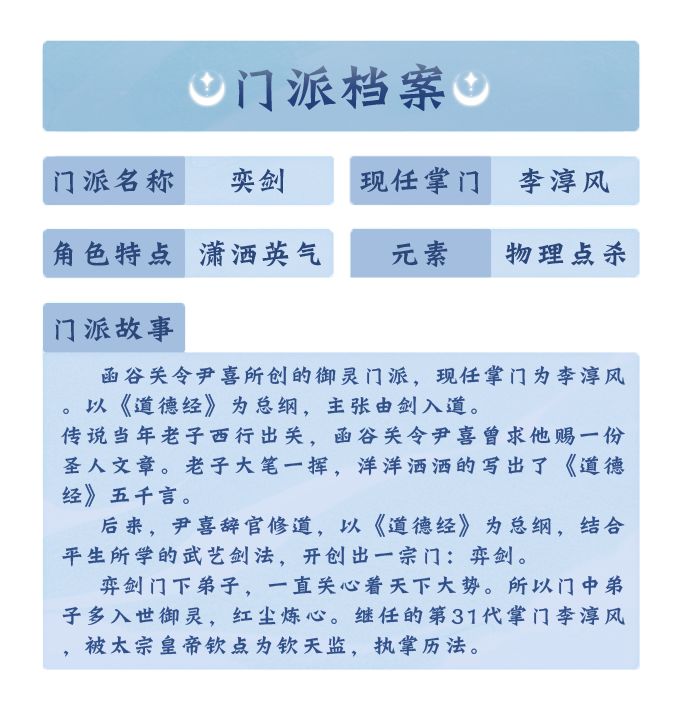 以《道德经》作为总纲的弈剑弟子,一身正气行天下!无论男女都英姿飒爽,潇洒不羁,喜欢做江湖侠客以及主力输出的御灵师们可以考虑选择归入弈剑门下哦!