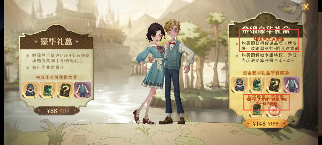 哈利波特,148元金缎豪华礼盒,诱导用户充值。礼盒里的描述:立即获得如图礼品,使用和阿瓦达索命的卡牌一模一样的图标,结果是个卡牌套,并且卡牌套的描述里故意强调阿瓦达索命。游戏自始至终都没有说过还有卡牌套这个设定,导致充值人误以为充值148元可以得到阿瓦达索命卡牌。