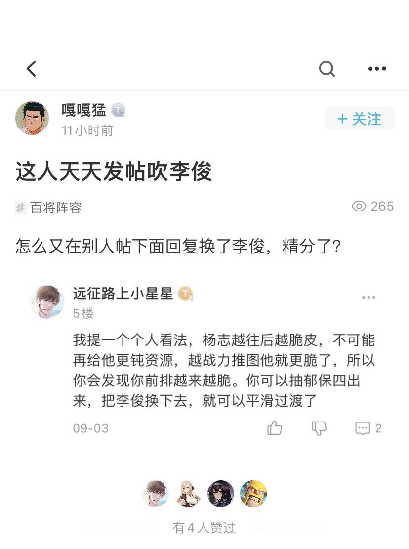 书归正传,我说下我留言的背景,某楼主卡关寻求帮助,我根据他的阵容觉得他前中期可能没必要同时上阵花荣和李俊,因此建议楼主下了李俊上辅助郁保四,无奈,被一些智商捉急的喷子见缝插针……