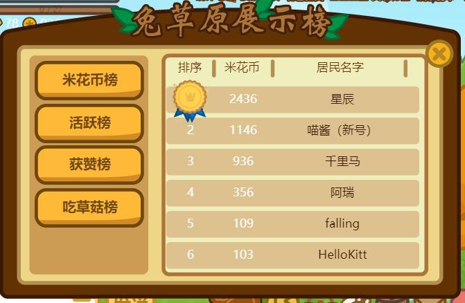 兔宝世界的米花币排行榜机制更新。