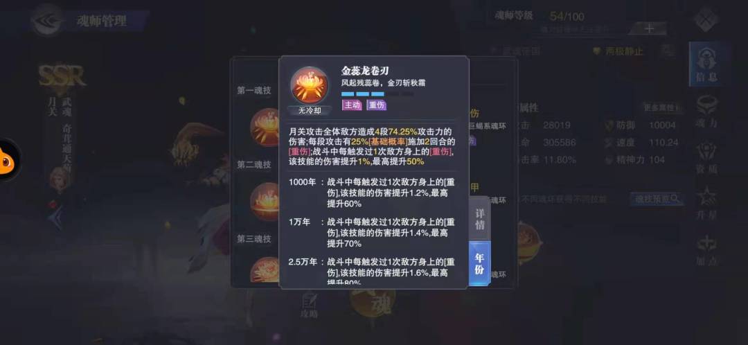 猛兽第一魂技是月关主要叠重伤技能,且重伤层数越高,伤害越高。5w年可提高百分百伤害。