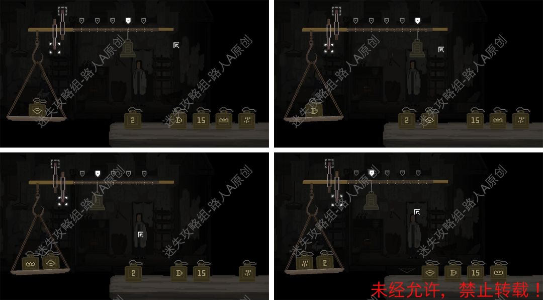 11.调查墙壁上的【杆秤】,确认4个符号砝码的重量。(小提的刻度单位是1,大提的刻度单位是5。)11.1