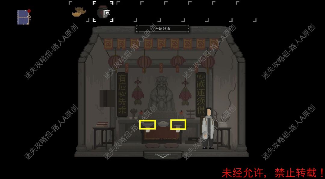 14.返回土地祠,把【纸元宝】放入左边的供品盘,把【酒】放入右边的供品盘,然后和【土地公】对话,获得【兔形钥匙】。14.1