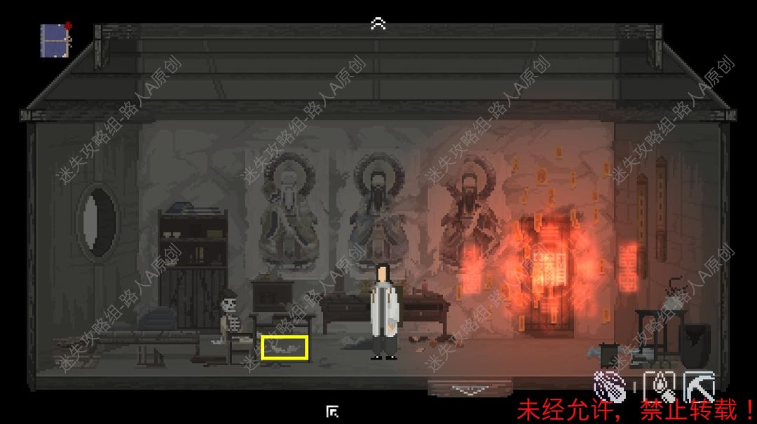 75.进入道观,调查地上的【纸条】,然后根据纸条上的图案提示,解除封印。75.1、75.2