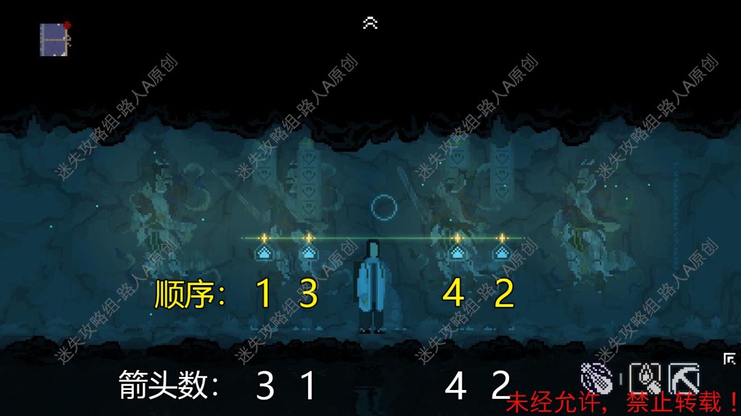 77.前往芦河村的山洞,解开圣坛的谜题。(该谜题需要上面和下面的石碑合并,并且高度刚好在水平线,也就是需要上面和下面的箭头数量相加等于5。而通过几次试验,可以发现上面石碑的下降顺序是固定的,下面石碑的上升顺序则是玩家操作顺序的倒退。)77.1