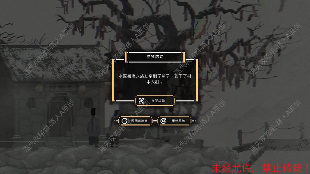 5.完成岳老六的逆梦(小慈要包子失败),在大树下拾取【蔷薇】。(通关后,可选择章节【第二章:木匠记忆关卡】。逆梦的具体解法请参考流程攻略。)5.1、5.2
