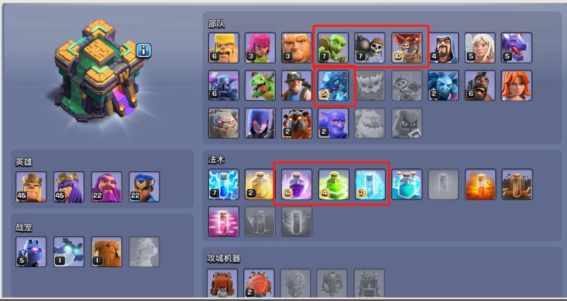 图中圈出的想必不难理解,哥布林、炸弹是为了开启超哥、超炸配合弹跳保证打钱发育,雷龙/气球/狂暴/冰冻是为了雷龙一字划保证打架能力。