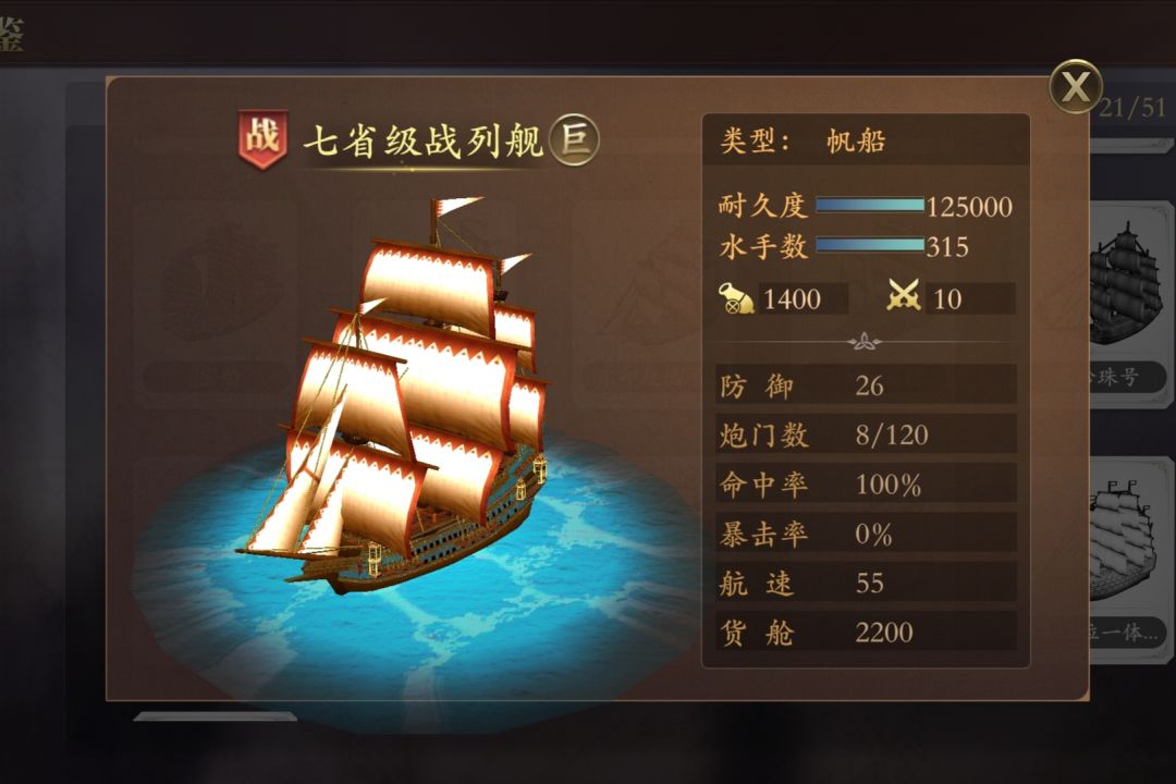 武装潜力=七省战列舰(需要图纸,独有),加农曲射炮,东印度商船(需要图纸)。
