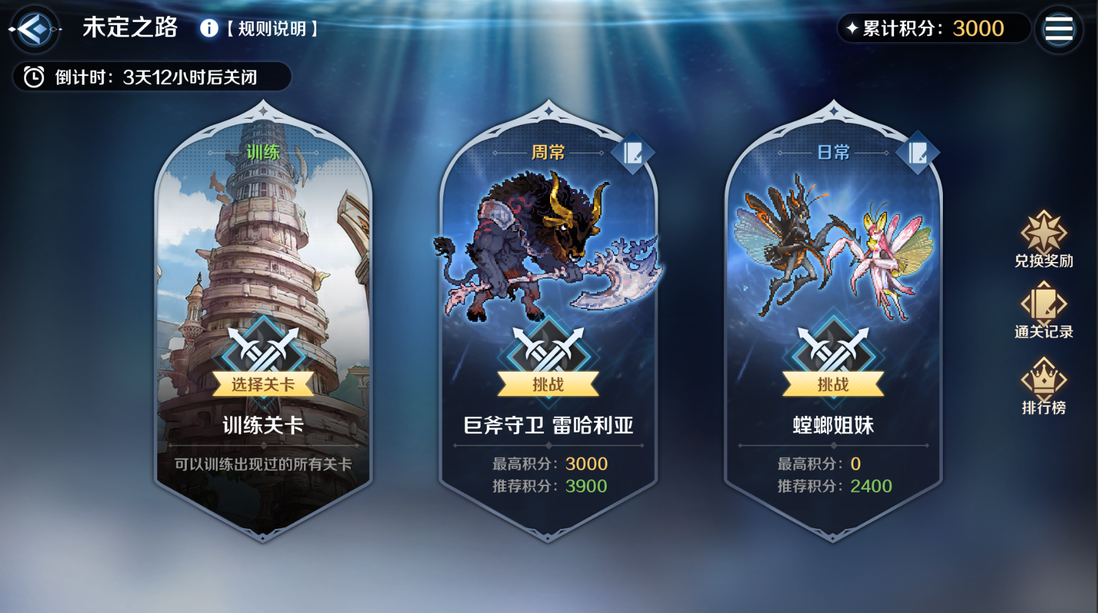 a、未定之路分为三种类型:训练(常驻无奖励),周常(活动期间开且有奖励),日常(活动期间开且有奖励