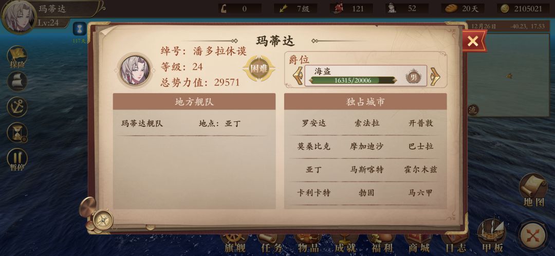 三、然后跟主线去西非,途径的空城全收了,西非一个势力边走边提高他好感度。(没主线的导航开迷雾很费劲,所以开着主线任务导航,看航线到一个城附近就打断导航进港,空城就刷满占有度,有任务就接一下。期间主角带主线给的指环统帅值满200了,我把她用玛莉里德换下船长位,让她就地开分舰队去了)。到南非也是如此,但记得别进本地势力主城,会强制开战。到印度洋,红海亚丁湾里几座城全空,刷满。跟着主线到巴士拉,重点来了,这里有个加80说服的黄玉耳坠(这是威压路线的关键饰品),需要巴士拉少量占有度,刷20占有度就够了。如果你去晚了NPC100%占有了,就先把好感度拉高,然后进城开战,在旅馆睡10天,抢了占有度(要强就抢90,容易停战)停战,然后一定要刷高他好感度和他结盟,防止他抢占有度反水。