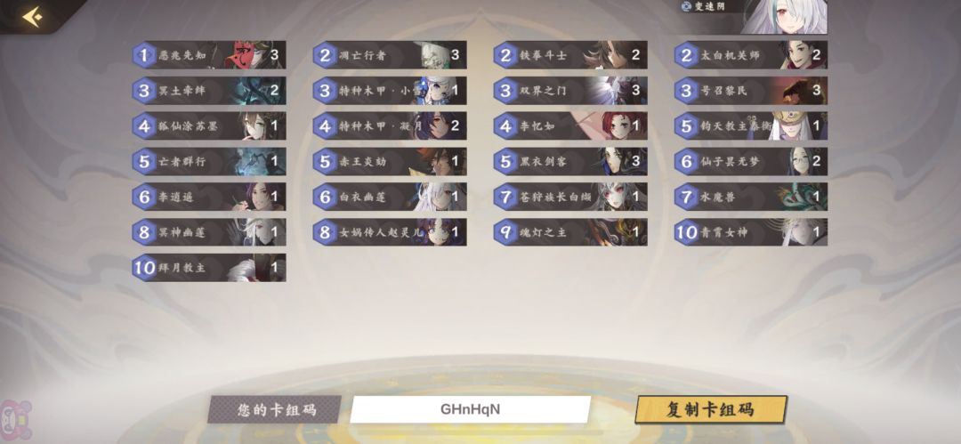 退坑了一两个月,回来感觉天梯变化不大,改了改阴的卡组构筑,加入了强势的太白机关师+号召黎民combo。