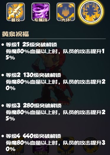 团队光环:队伍血量健康时为全队提供高额的攻击输出加成,残血又能收割战场。与自身被动形成良性循环