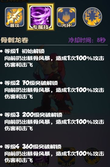 专属技:标准的100%伤害专属技能,造成伤害的同时还能击飞敌人,变相为自身提供了良好的输出环境