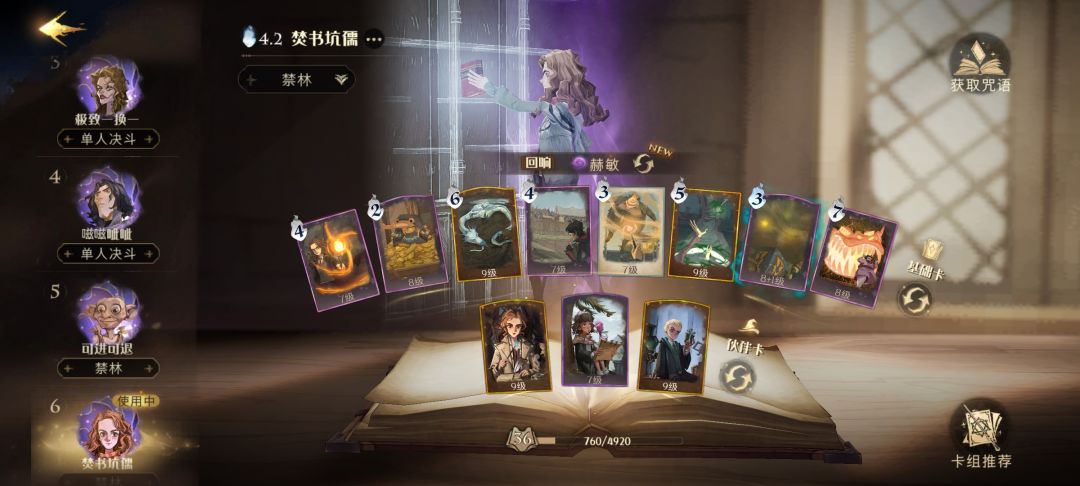 建议赫敏烟花流,携带必备的原地放盾和加血技能,最佳卡牌依次类推是: