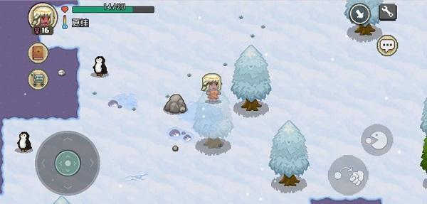 雪地↓{企鹅和海狗。玩家也可以在雪地上堆雪人,在冰洞上钓鱼,金矿脉,雪堆}
