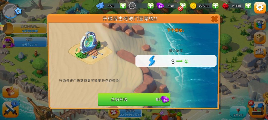 2.最开始的钻石一定一定要用于升级龙巢,才有更多的孵蛋位置,等到后期孵一个蛋要两天多时,就一个蛋位,那可有够受得了(😶升到三个孵蛋位置基本够了),后期有余力可以升传送门等级,如图三四