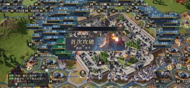7月25日,【逆战天下】开启禁地禁矿军令,进入全面进攻战斗状态,大批成员落地宜春周边,加快推城节奏。中午12时,【逆战天下】已推到宜春城下,准备包围起来。下午18时,【逆战天下】拿下宜春,继续向江淮州府许昌进军。此时【厚德载人】早已在许昌区域内层层马拒围起,要塞包围城池,但【厚德载人】未对许昌发起总攻,不能有效的得到地域国土保护,无法抵御【逆战天下】的快速进攻趋势。