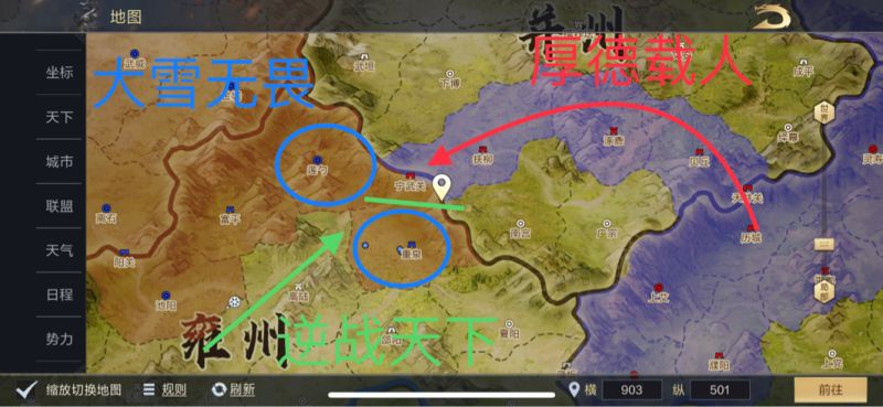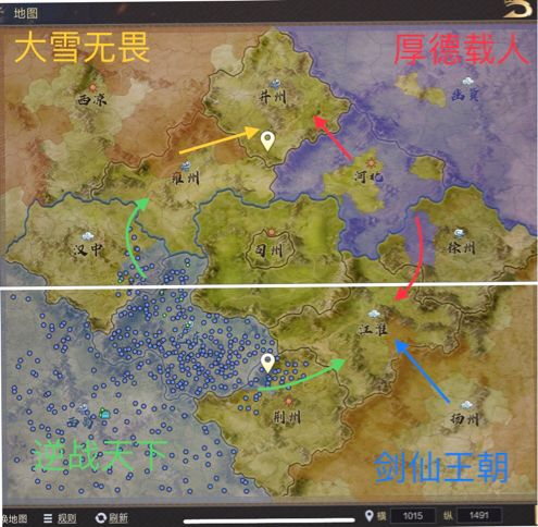 7月20日【逆战天下】成功拿下巴东州府巴丘,完成了在巴东区域的城池任务,下一步收复荆州区域,向江淮进军,收复汉中区域向雍州进发,【厚德载人】在幽翼仅剩州府未拿,河北地区四城未拿,向江淮地区徐州区域迈进。【大雪无畏】打通关卡宁武关,开始向并州城池发起扩张