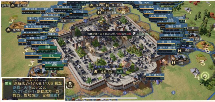 7月17日早上8时,【逆战天下】顺利拿下西蜀州府成都,立国旗号为“厉”,得到了国土保护,成为本战区里最快立国的联盟。