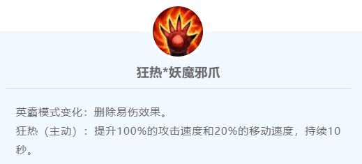 狂热(主动):提升100%的攻击速度和20%的移动速度,持续10秒。