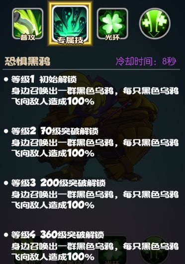 专属技:标准的100%cd专属技能伤害,伤害以召唤乌鸦打出,提高技能命中率