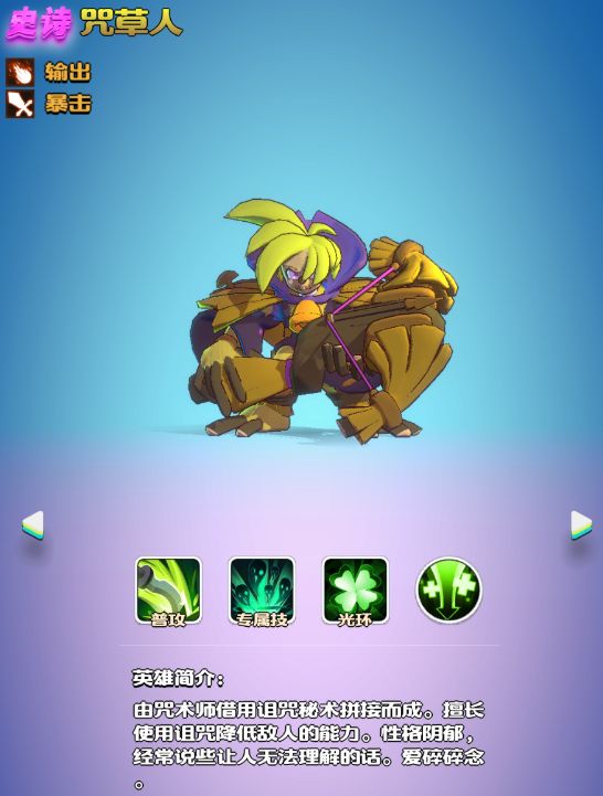 【咒草人】 森林属性阵营史诗级角色。如果你说【咒草人】是辅助,那么他的输出一定会超出你的想象,如果你说【咒草人】是输出,他的光环效果会让你整个队伍的战力达到另外一个高度。在所有半辅助半输出角色中,他自身以没有任何debuff的限制,超模出现在我们眼前