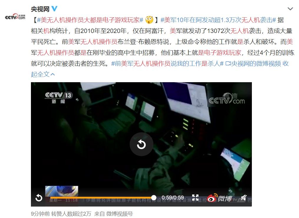 央视:美军无人机操作员大都是高中生电子游戏玩家