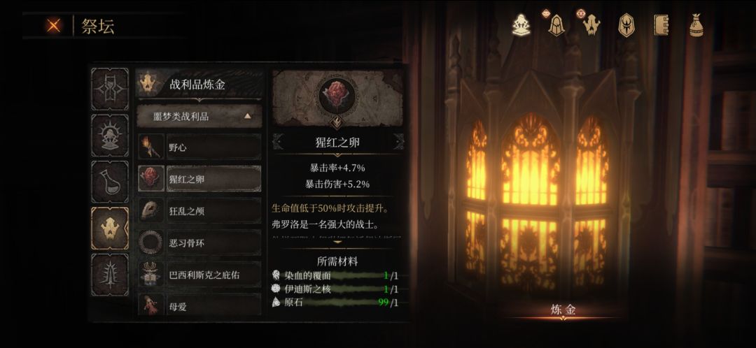 战胜弗罗洛后获得素材染血的覆面,和伊迪丝之核(伊迪丝必掉一个)合成猩红之卵