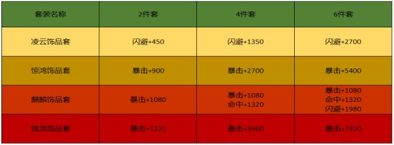 由于凌云饰品套装增加的闪避属性对于玩家的提升帮助并不大,故这里套装混搭的分析排除凌云饰品,请佩戴凌云饰品的各位玩家见谅。